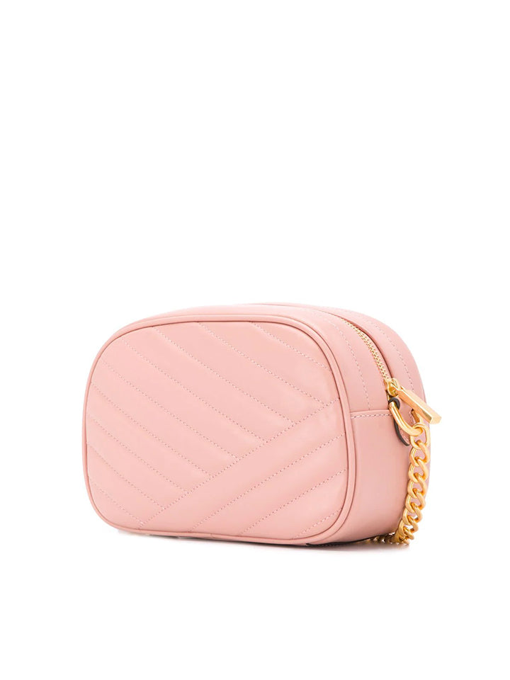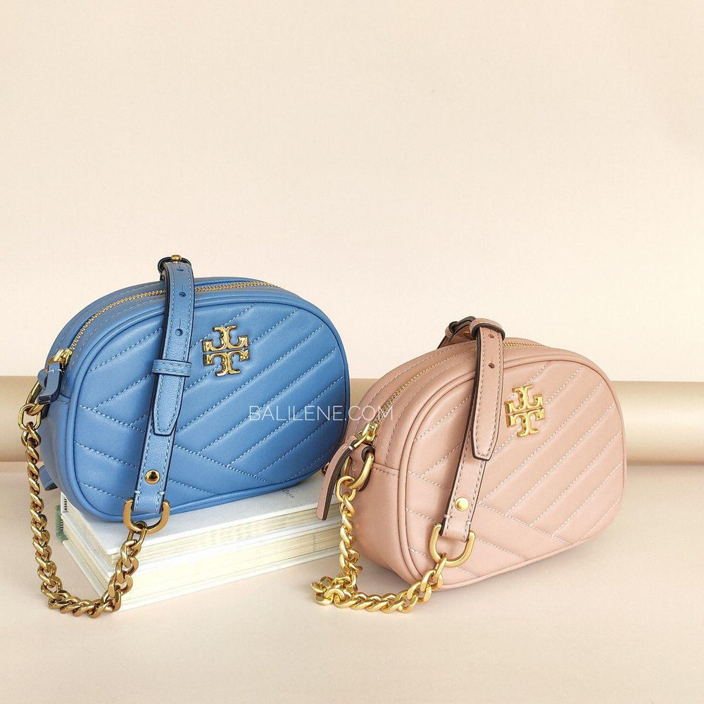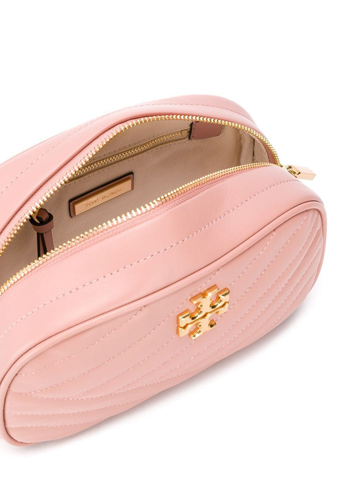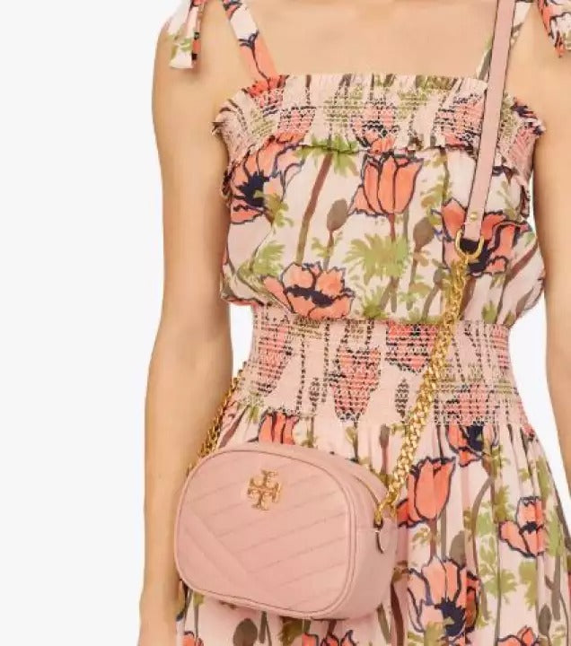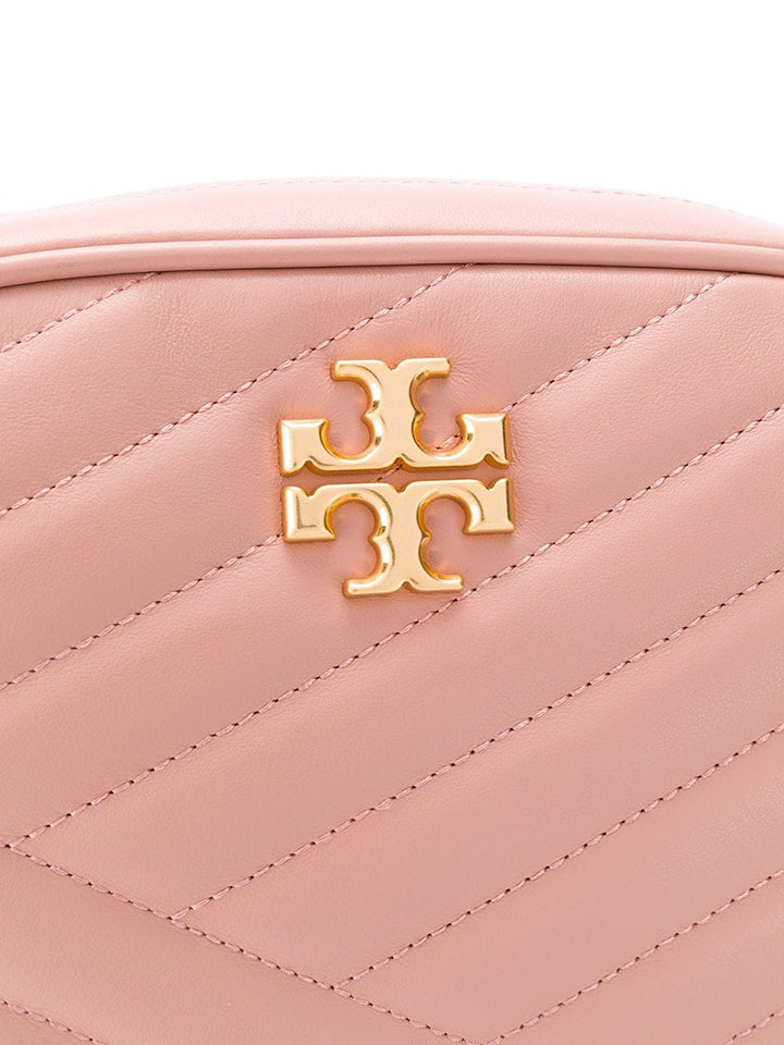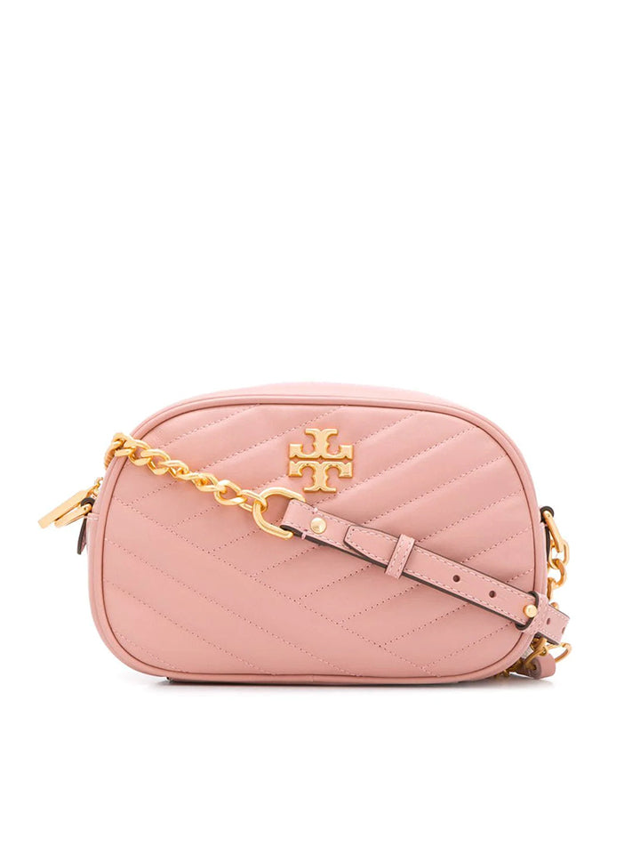 The Tory Burch 60227 Kira Chevron Camera Bag in Pink Moon offers a refined blend of style and function. Crafted with signature chevron quilting, this compact bag features a sleek silhouette perfect for carrying essentials.