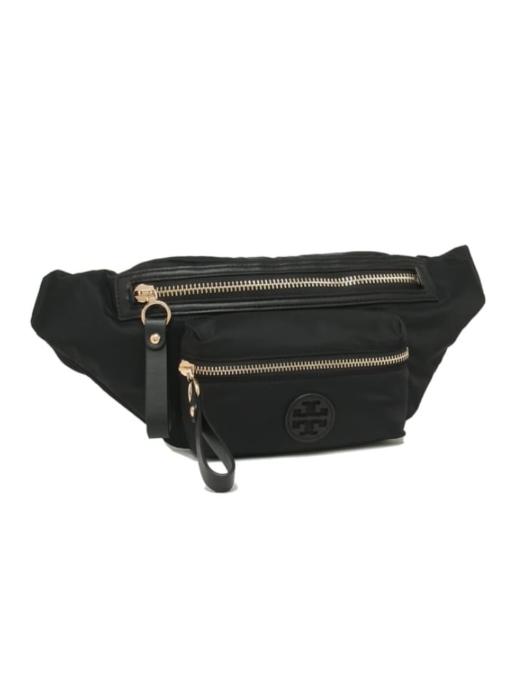 The Tory Burch Nylon Belt Bag is an ideal travel companion. Crafted from durable black nylon with gold-tone hardware, this sleek bag features a zip fastening and an exterior zip pocket.