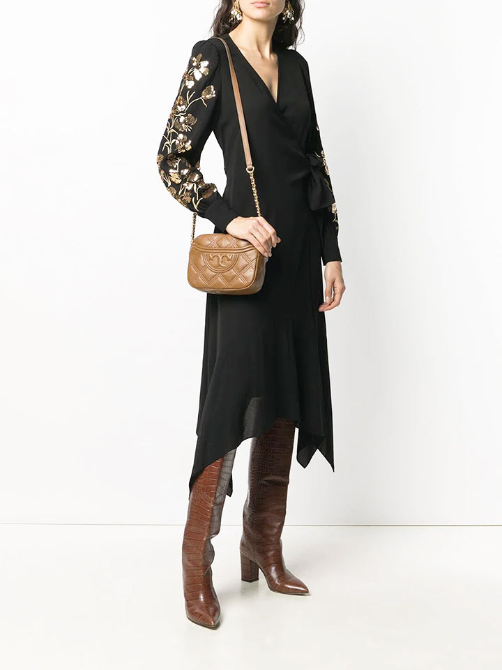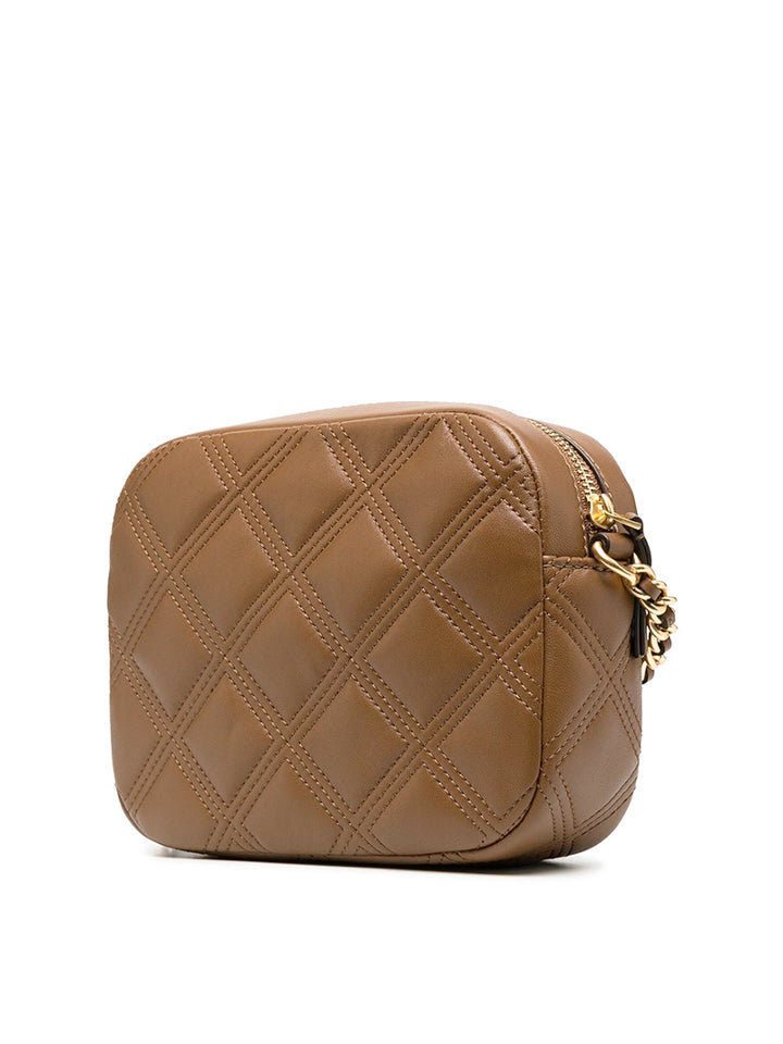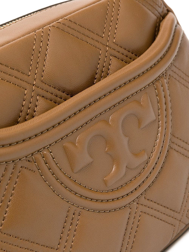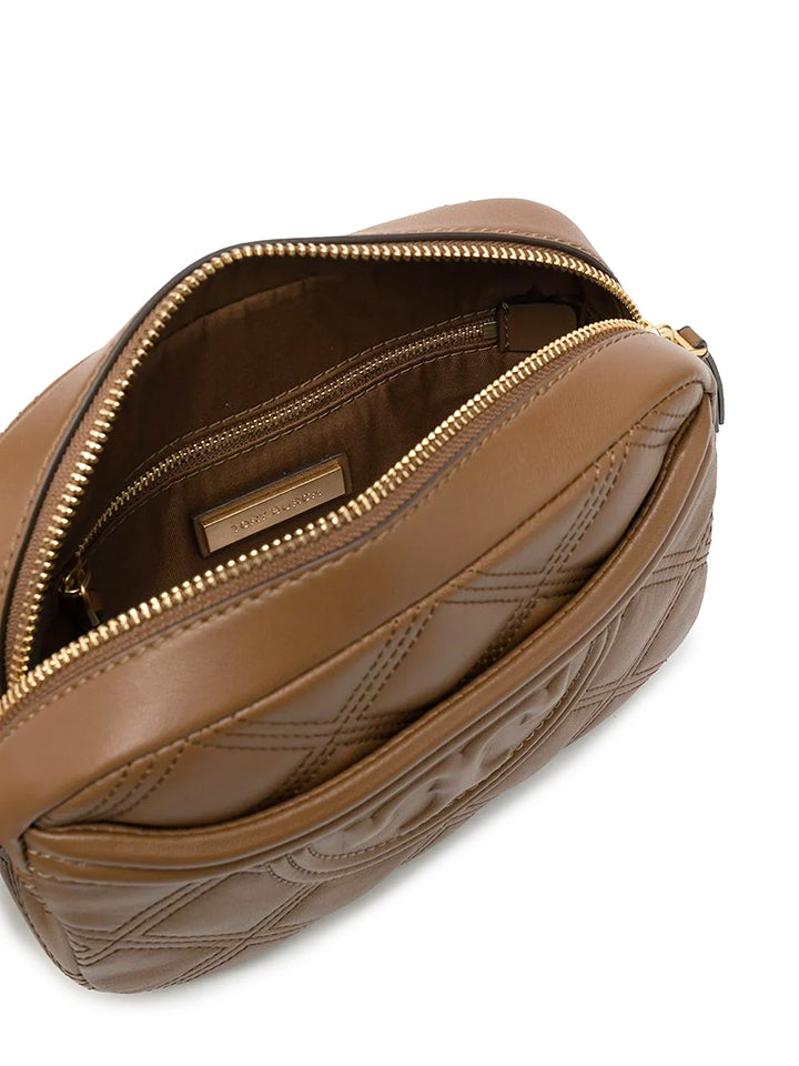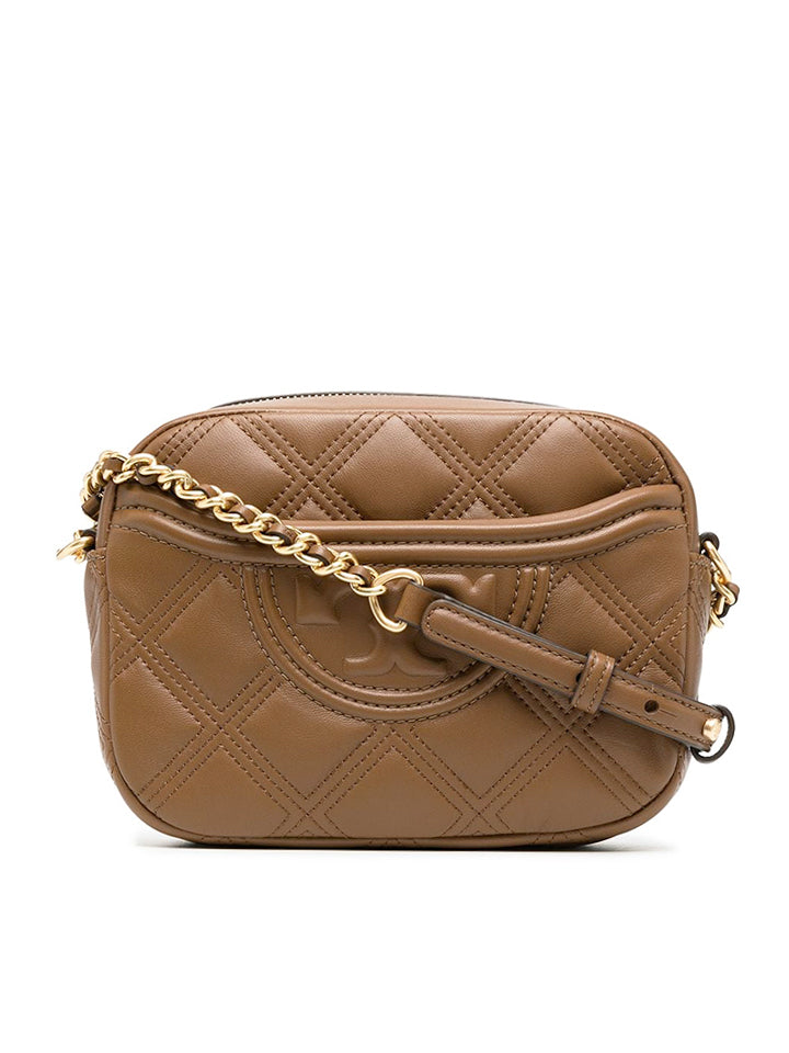 The Fleming Camera Bag is made of the softest leather that's subtly distressed and glazed, with oversized diamond quilting and an embossed Bombe logo. The strap is adjustable and braided with brushed gold chain.