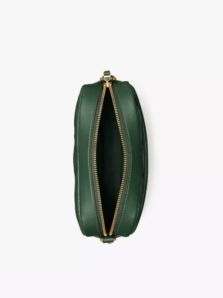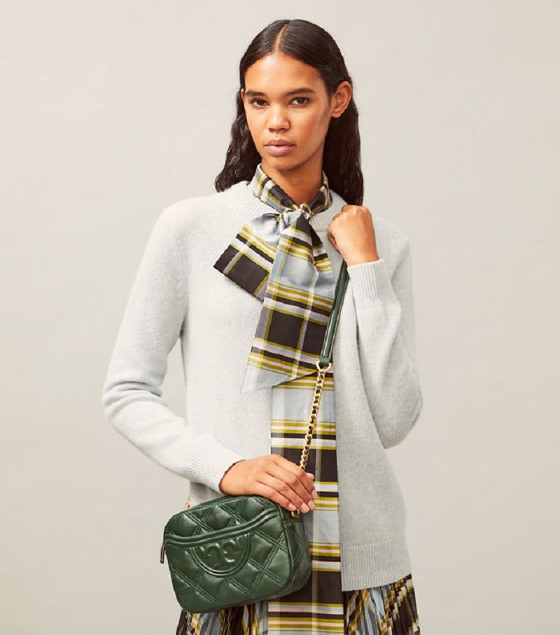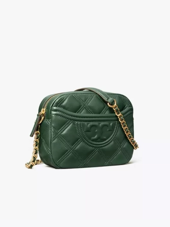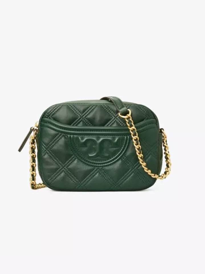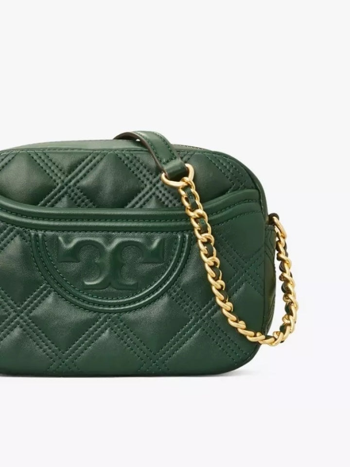 The Fleming Camera Bag is made of the softest leather that's subtly distressed and glazed, with oversized diamond quilting and an embossed Bombe logo. The strap is adjustable and braided with brushed gold chain.