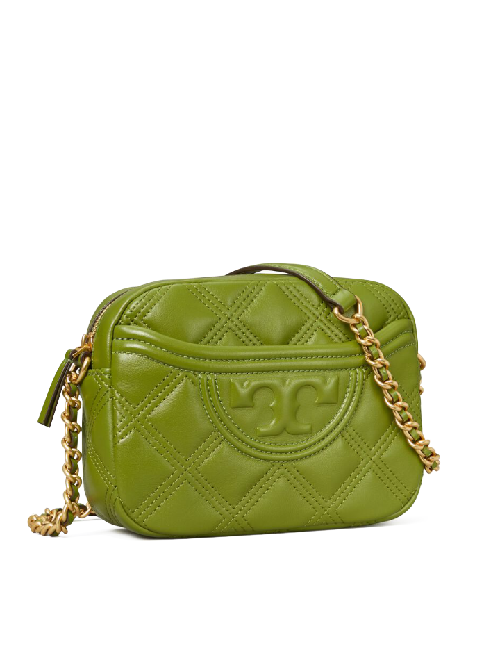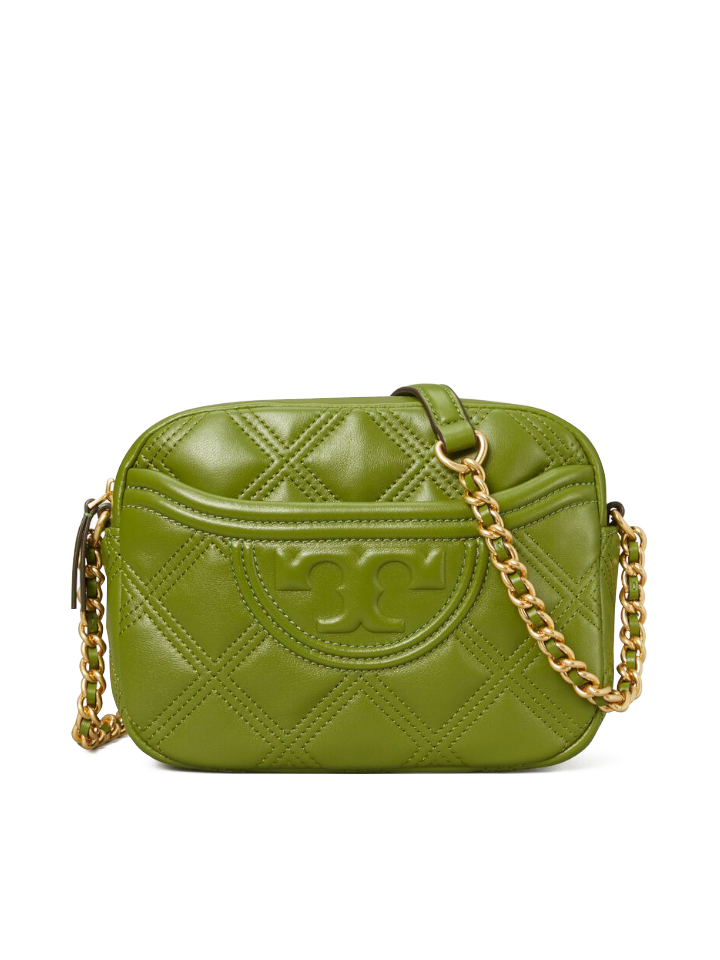 The Fleming Camera Bag is made of the softest leather that's subtly distressed and glazed, with oversized diamond quilting and an embossed Bombe logo. The strap is adjustable and braided with brushed gold chain.