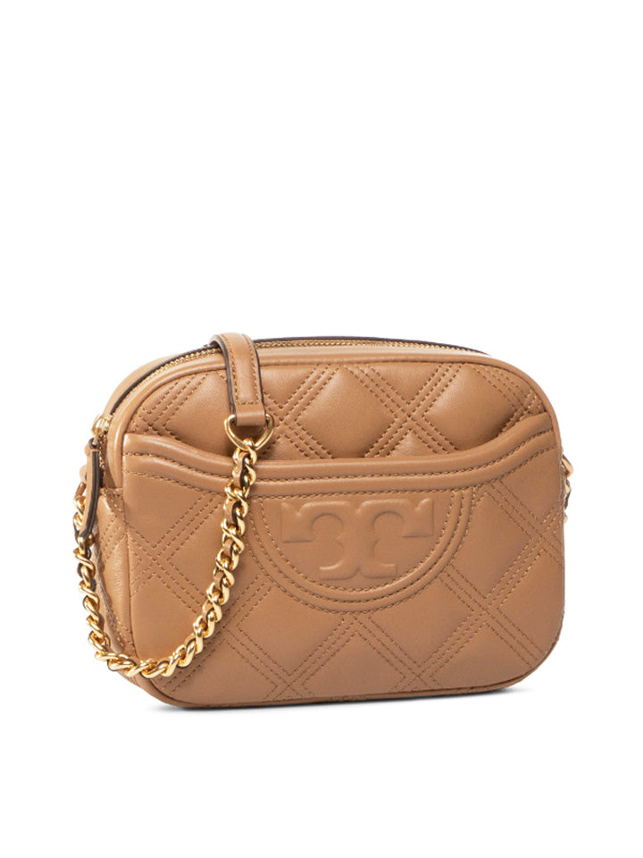 The Fleming Camera Bag is made of the softest leather that's subtly distressed and glazed, with oversized diamond quilting and an embossed Bombe logo. The strap is adjustable and braided with brushed gold chain.
