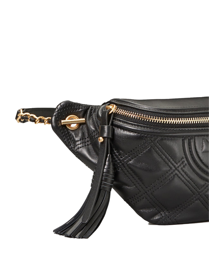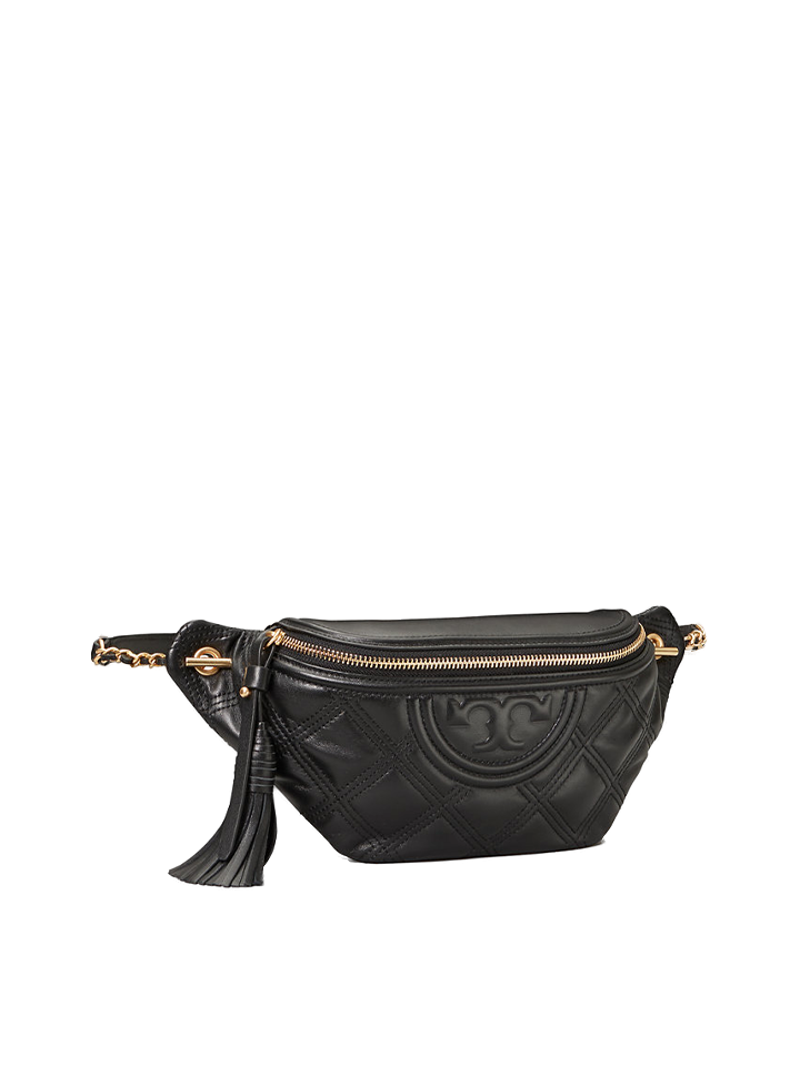 This Tory Burch Fleming Soft Belt Bag in black offers a sleek blend of style and functionality. Crafted from soft leather, it provides a comfortable yet elegant accessory to keep essentials close.