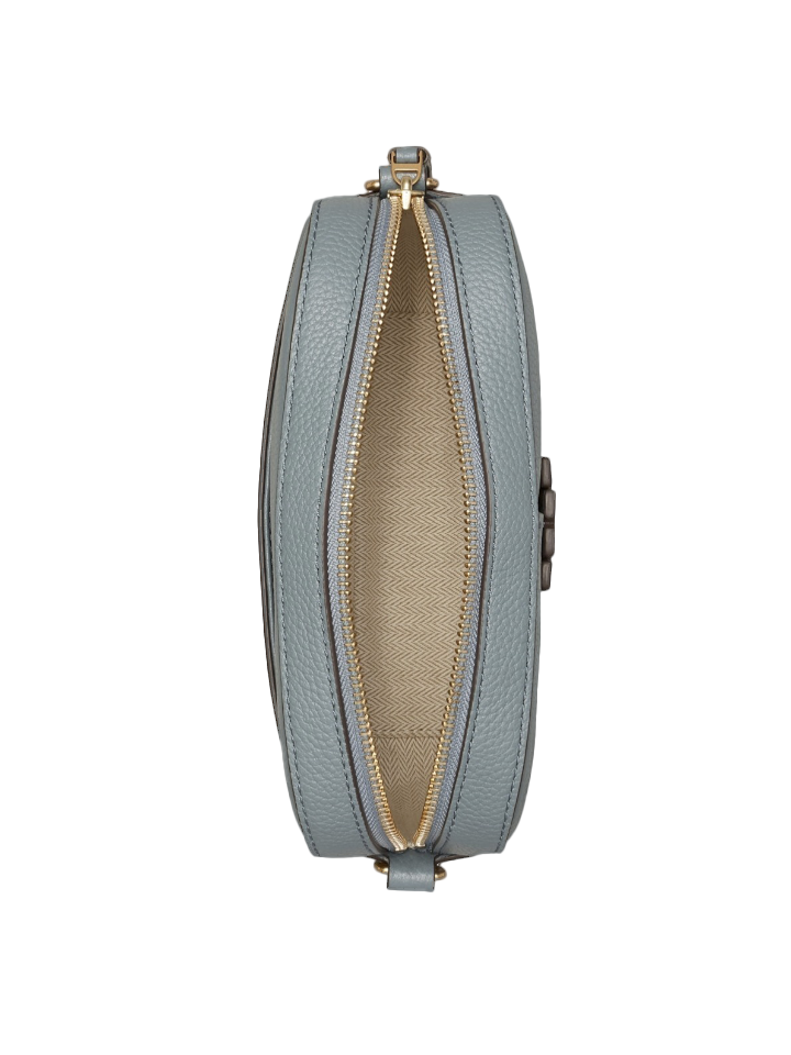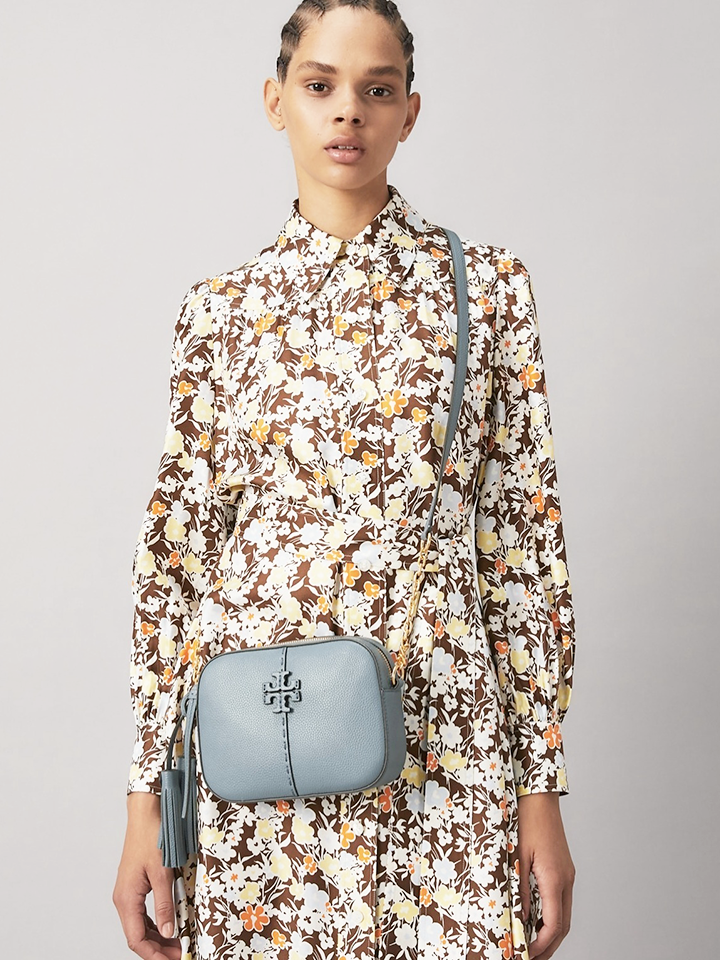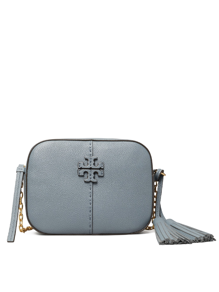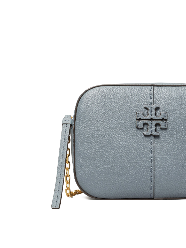 The Tory Burch 64447 McGraw Camera Bag in Brunnera is a refined accessory blending sleek design with practical functionality. Expertly crafted, its compact silhouette features a secure zip closure and adjustable strap for versatile wear.
