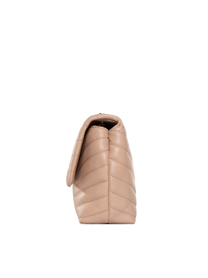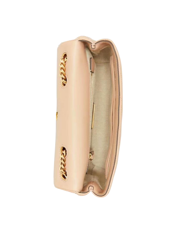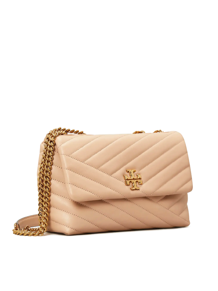 The Tory Burch Kira Chevron Small Convertible Shoulder Bag in Devond Sand features a signature chevron-quilted leather design with a compact silhouette ideal for daily essentials. Its convertible strap offers versatile wear options as a shoulder or crossbody bag, combining functionality with timeless style.