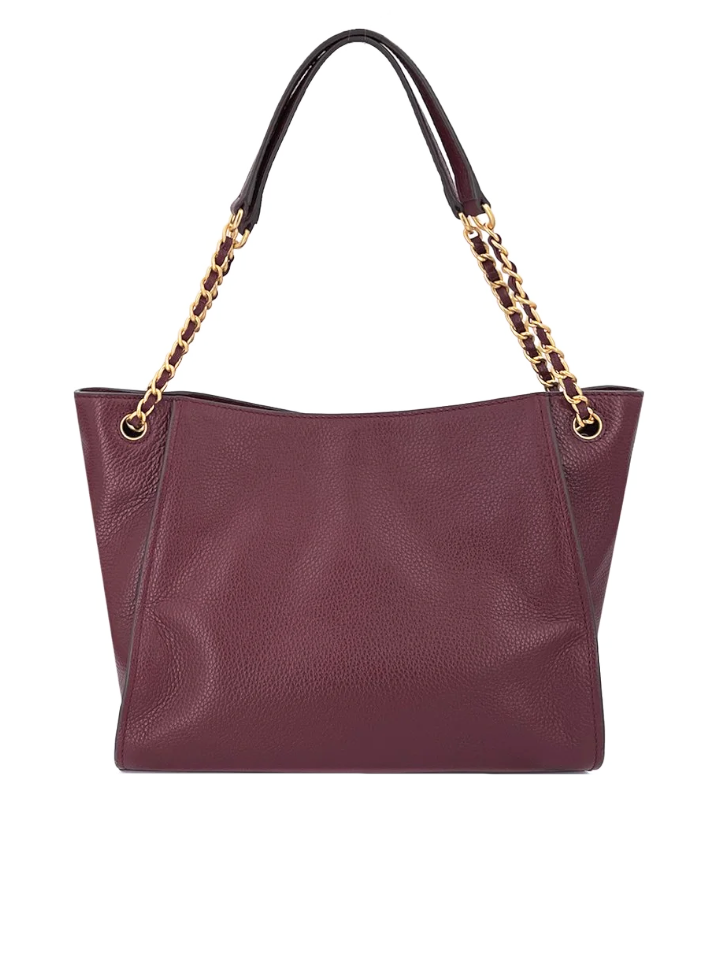 The Tory Burch Britten Small Slouchy Tote in New Plum offers a refined balance of style and practicality.