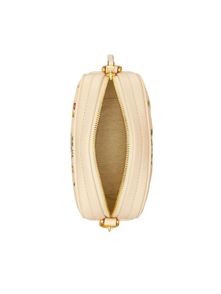 The Tory Burch Kira Chevron Printed Small Camera Bag in Rose Floral offers a sophisticated blend of style and functionality. Its compact design is ideal for carrying essentials securely, while the signature chevron pattern with delicate rose floral accents adds an elegant touch.
