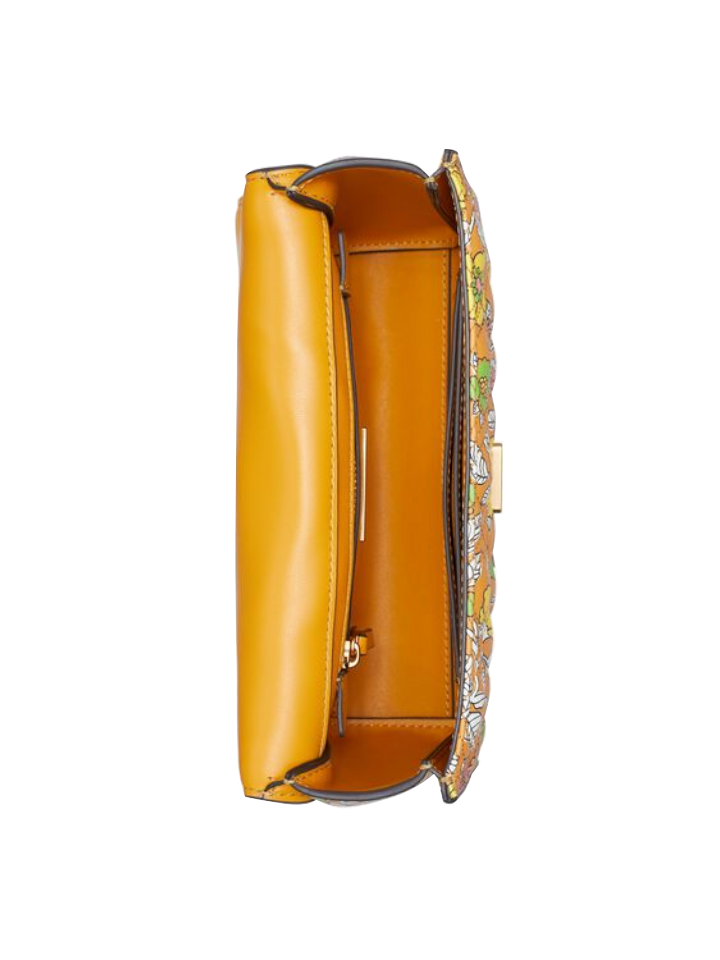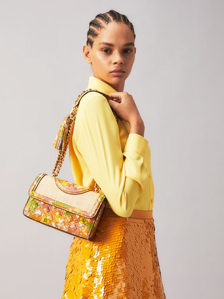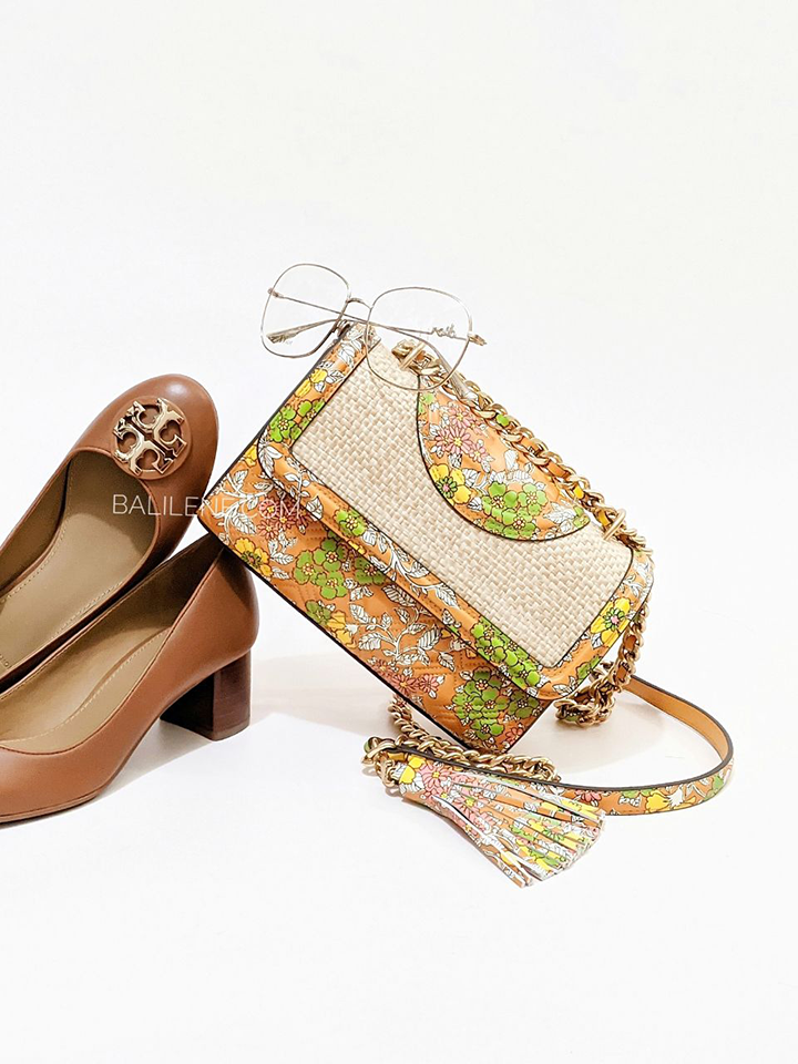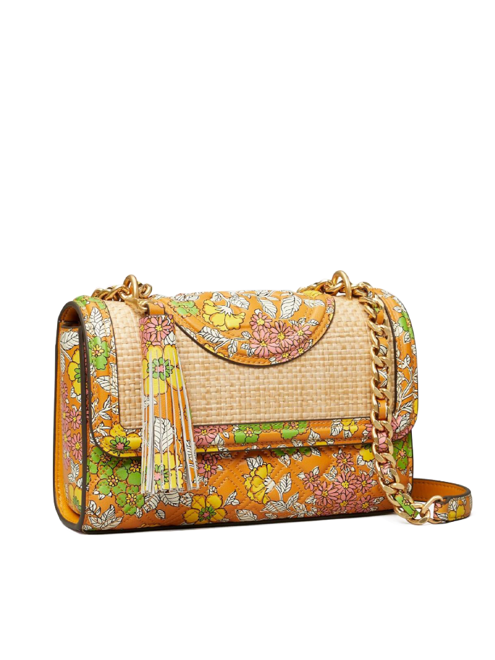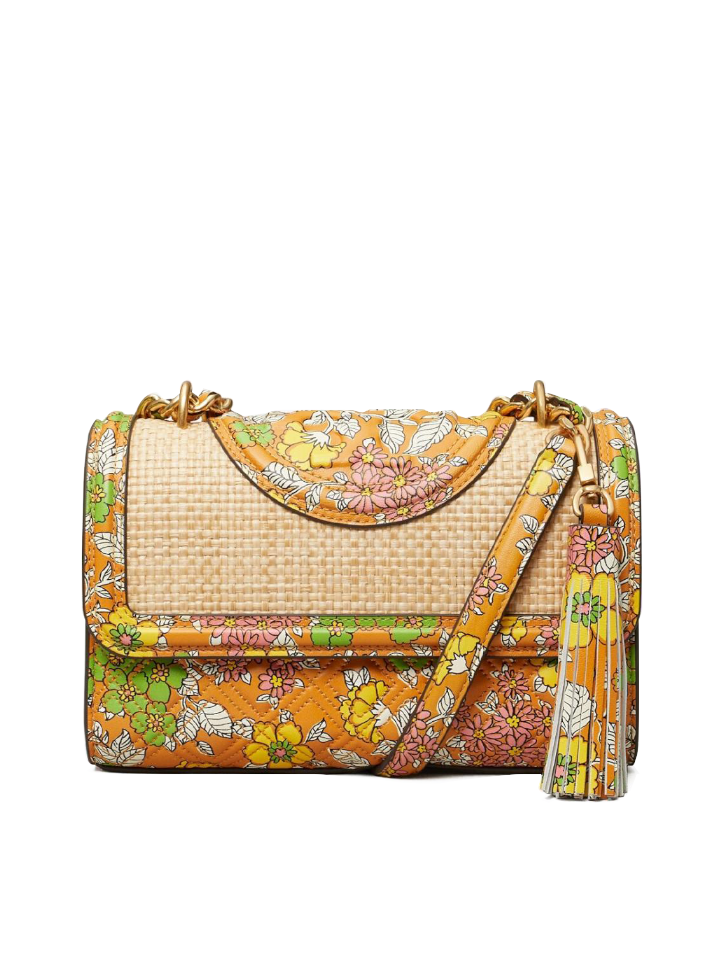 The Tory Burch 76962 Fleming Printed Straw Small Convertible Shoulder Bag in Natural Butternut combines craftsmanship with versatility.