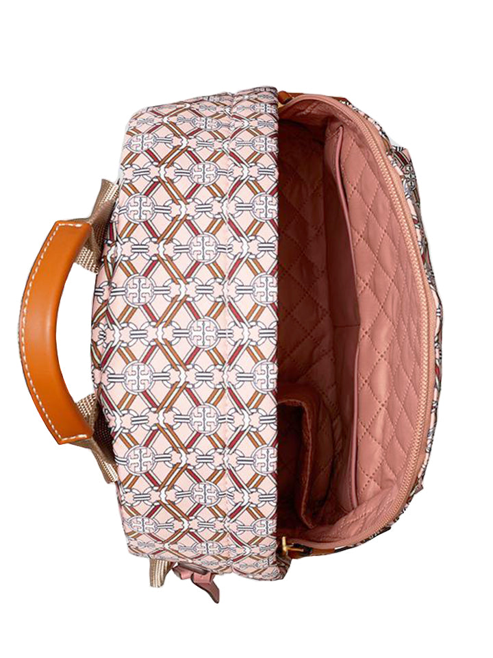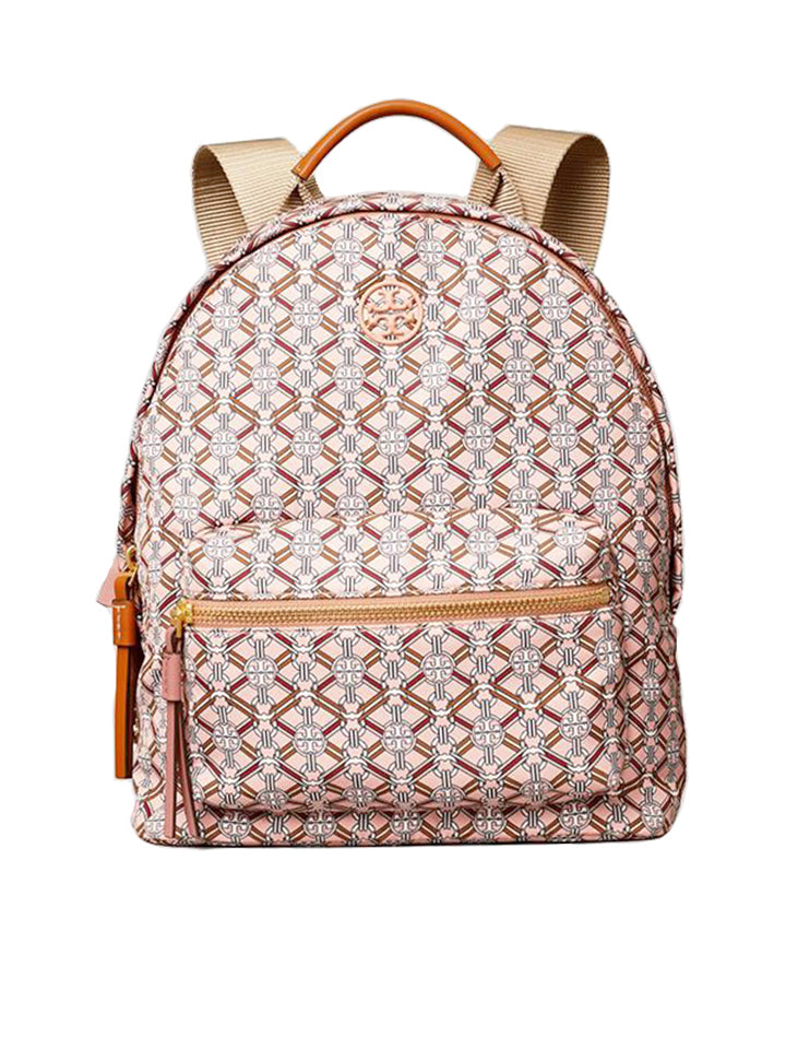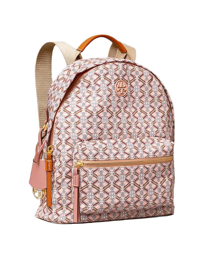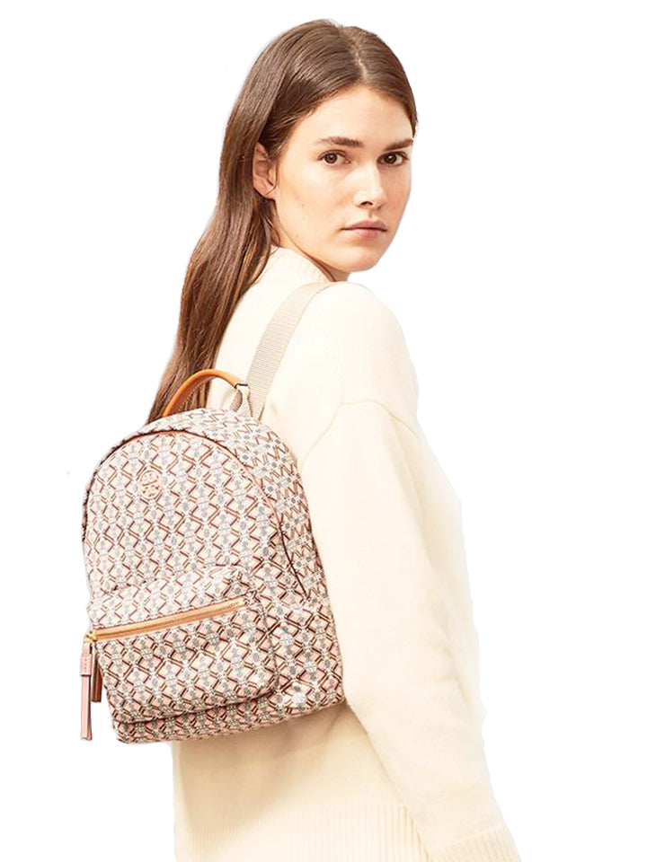 The Tory Burch Piper Printed Small Zip Backpack in Pink Gemini Link Medallion combines stylish design with practical convenience. Crafted with durable materials and accented by the distinctive Gemini Link Medallion print, this compact backpack offers secure zip closure and adjustable straps for comfortable wear.