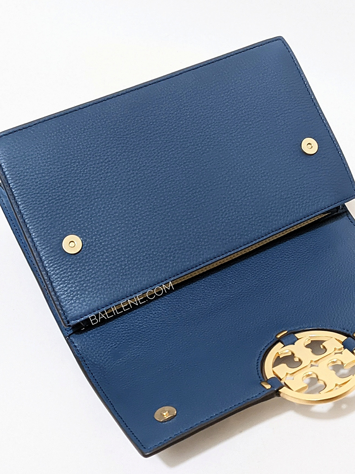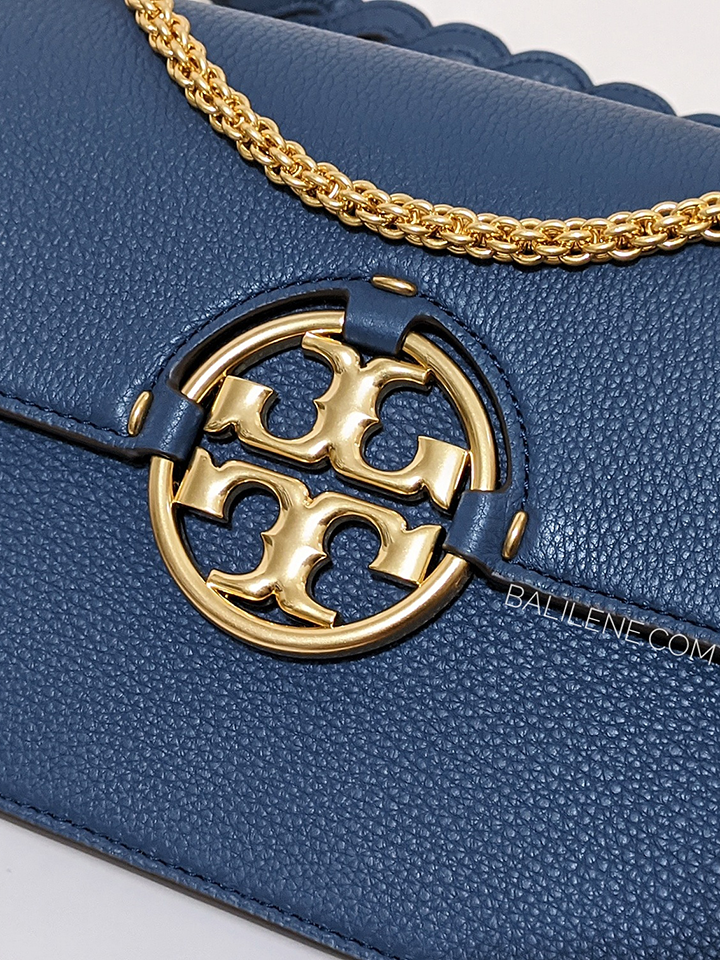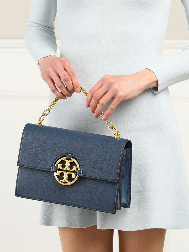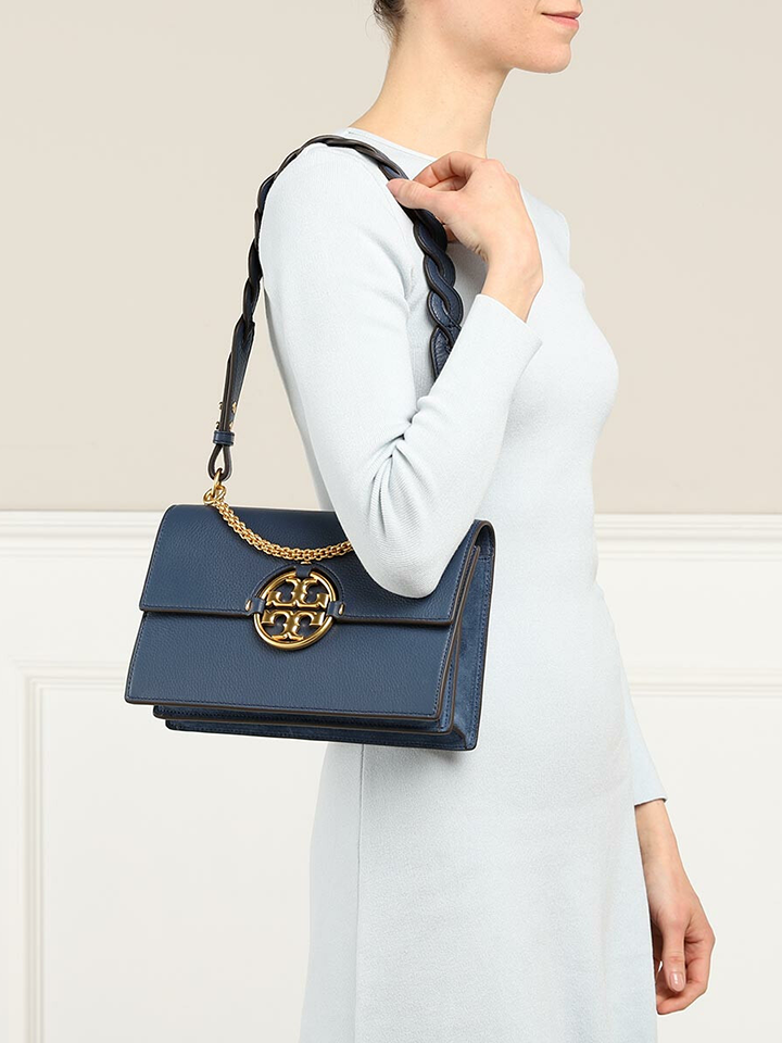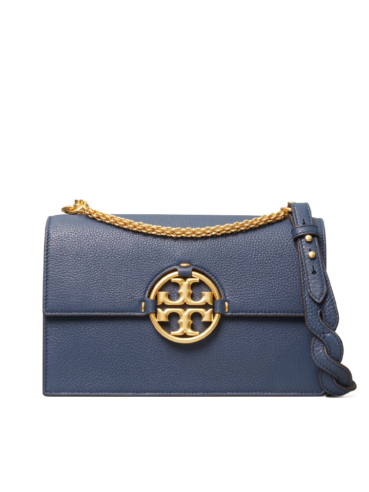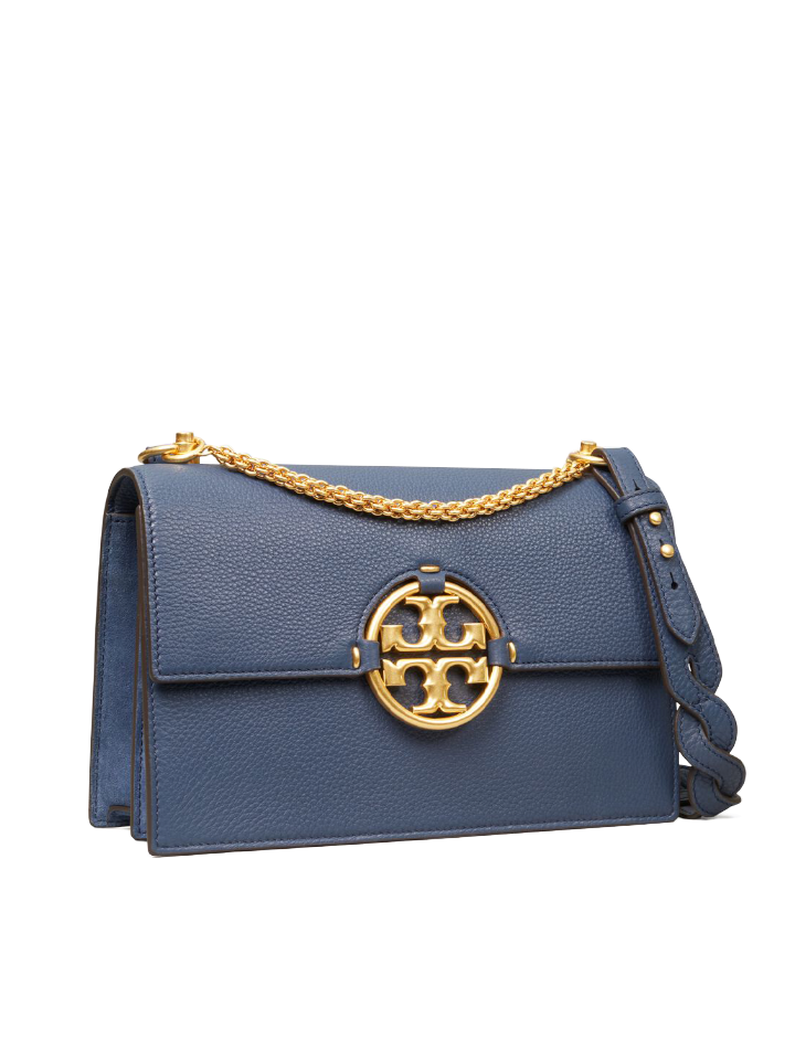 The Tory Burch 81688 Miller Shoulder Bag in Bluestone blends timeless sophistication with practical design. Crafted from high-quality leather, it features the iconic double-T logo and a versatile shoulder strap for comfortable wear.