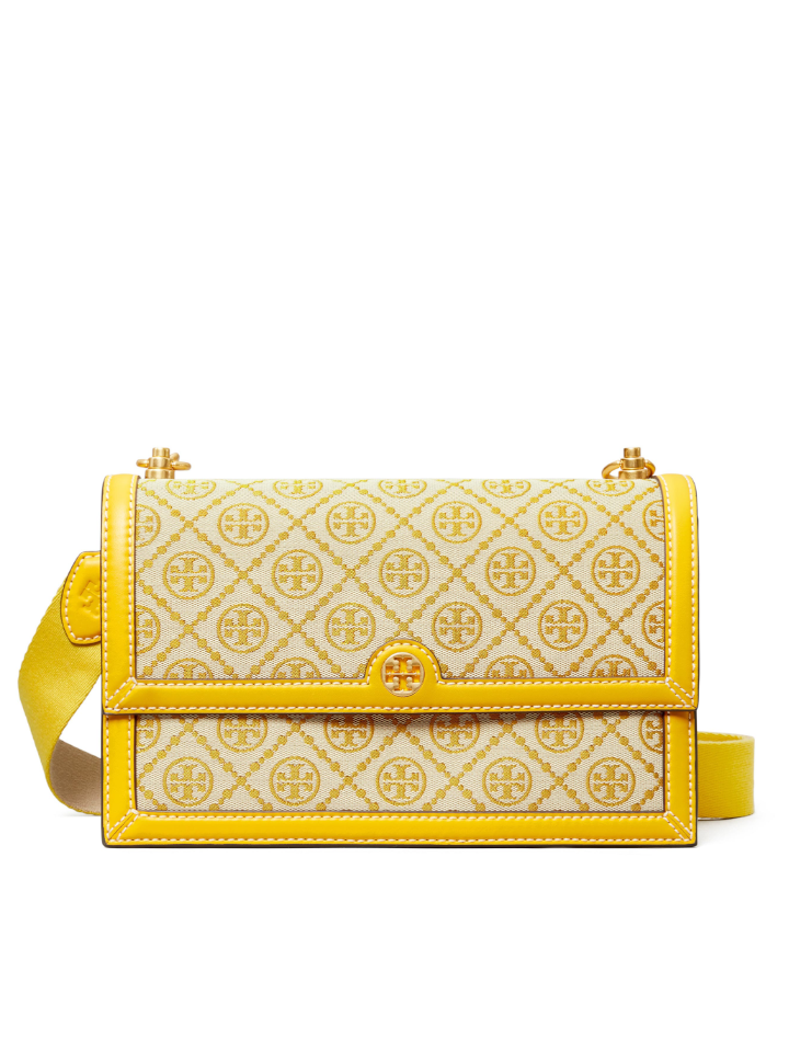 The Tory Burch 81863 T Monogram Jacquard Shoulder Bag in Goldfinch combines timeless elegance with practical design. Crafted from durable jacquard fabric featuring the iconic T monogram, this shoulder bag offers a sophisticated look while maintaining lightweight comfort.