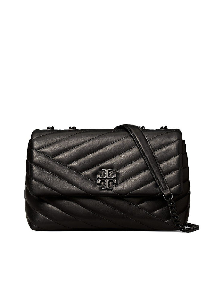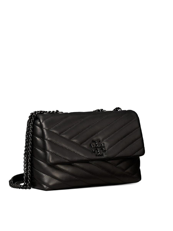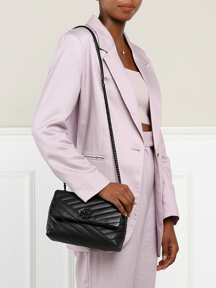 This Tory Burch 82285 Kira bag is perfect for those on the go! Crafted with chevron powder coated lambskin, it features a magnetic snap closure, adjustable chain strap and leather shoulder guard for convenience. Boasting 2 interior slit pockets and 1 zipper pocket, it's the perfect size for an iPhone 13 Pro Max or Samsung Galaxy Note 20.