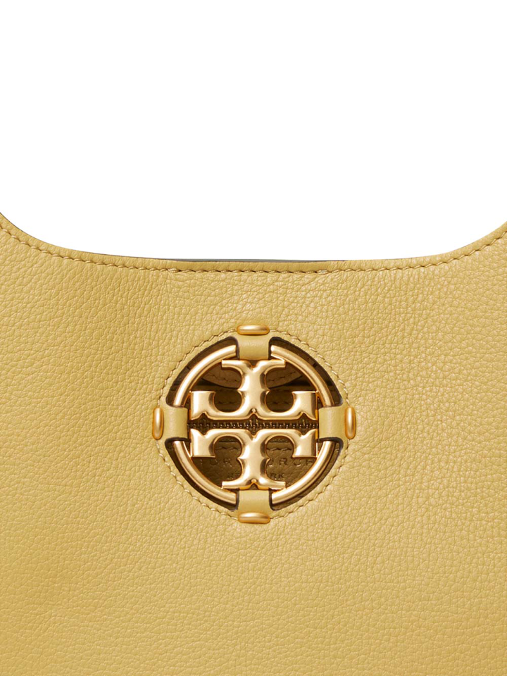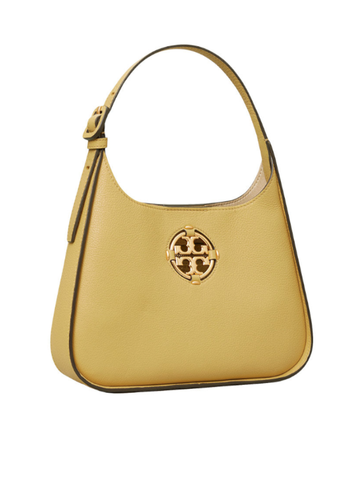 The Tory Burch 82982 Miller Small Hobo Bag in Beeswax offers a refined blend of style and practicality. Crafted from supple leather, its compact silhouette comfortably holds essentials while maintaining a chic, effortless look.