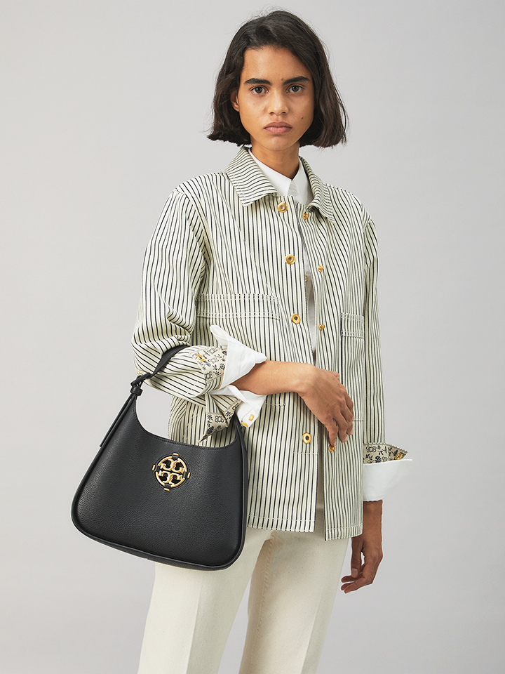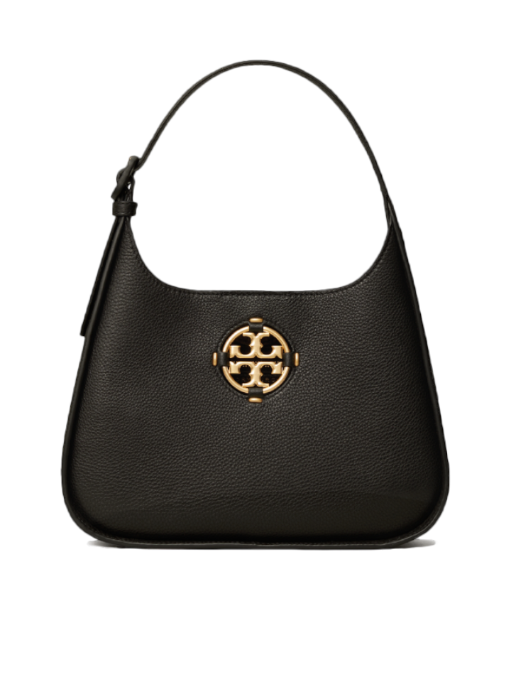 The Tory Burch 82982 Miller Small Hobo Bag in Black combines refined craftsmanship with functional design. Its compact silhouette offers versatile everyday wear, crafted from premium leather that ensures durability and a sleek finish.