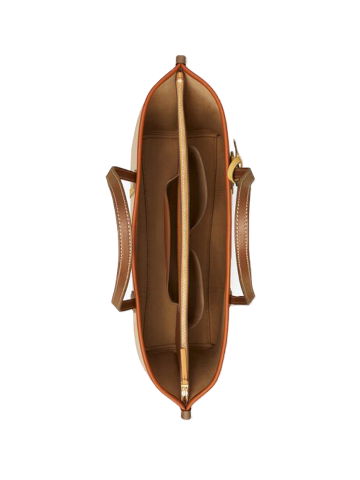 The Tory Burch 86501 Perry Color-Block Triple-Compartment Tote in Beeswax Hot Chocolate combines practicality with refined style. Featuring three spacious compartments, it offers organized storage for all your essentials.