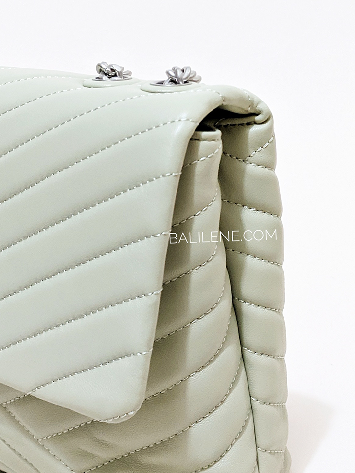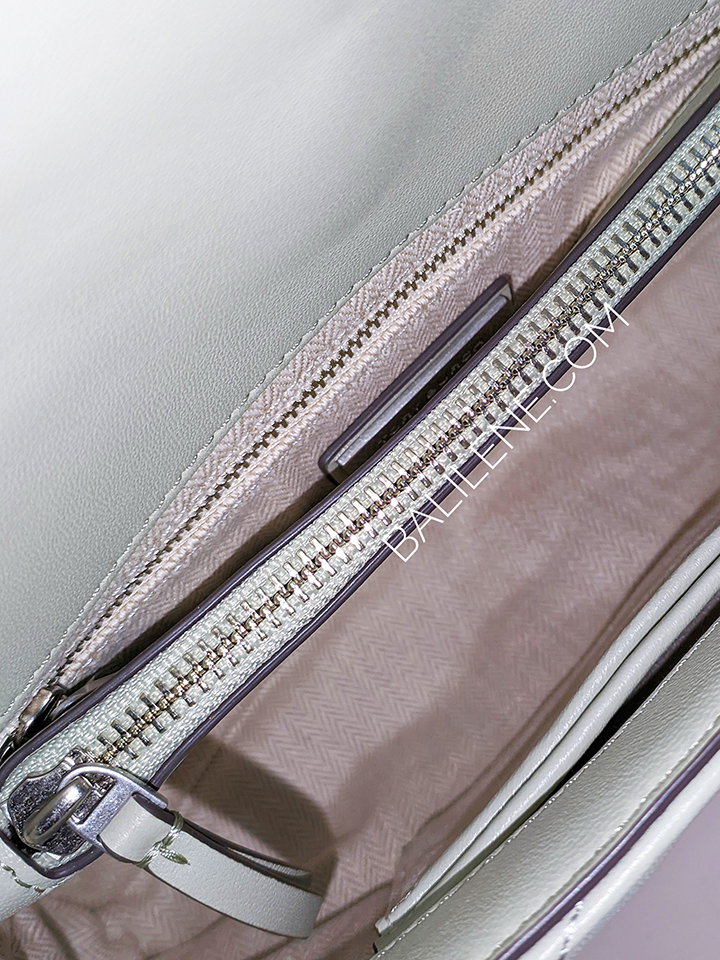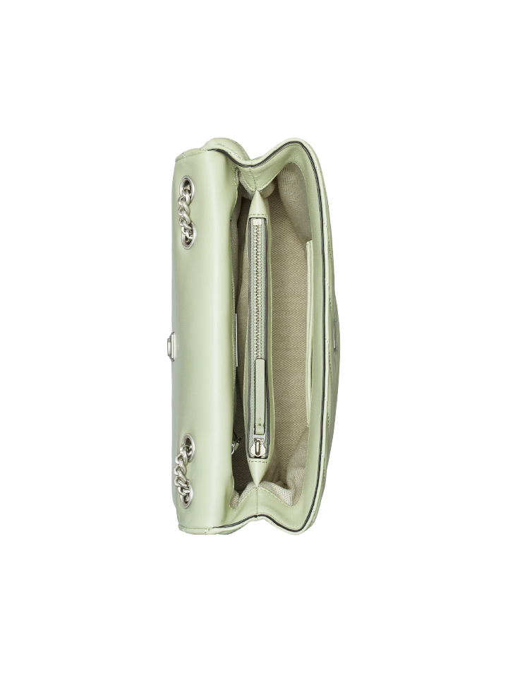 The subtle Pine Frost color adds understated elegance, while the signature logo clasp enhances its refined appeal. Perfect for carrying essentials with style and ease, this bag balances luxury and practicality for the discerning woman.
