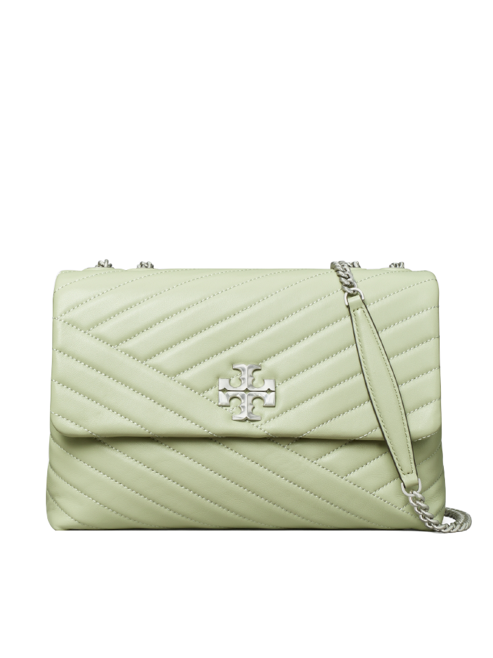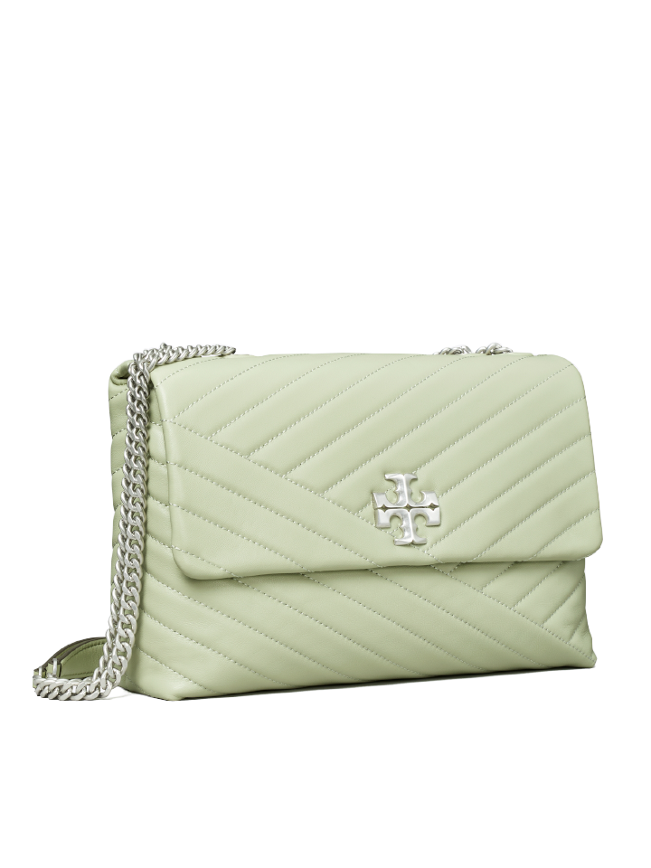 The Tory Burch Kira Chevron Convertible Shoulder Bag in Pine Frost combines sophisticated design with versatile functionality. Crafted with chevron-quilted leather, it features a convertible strap that allows seamless transition from shoulder to crossbody, offering adaptability for various occasions.