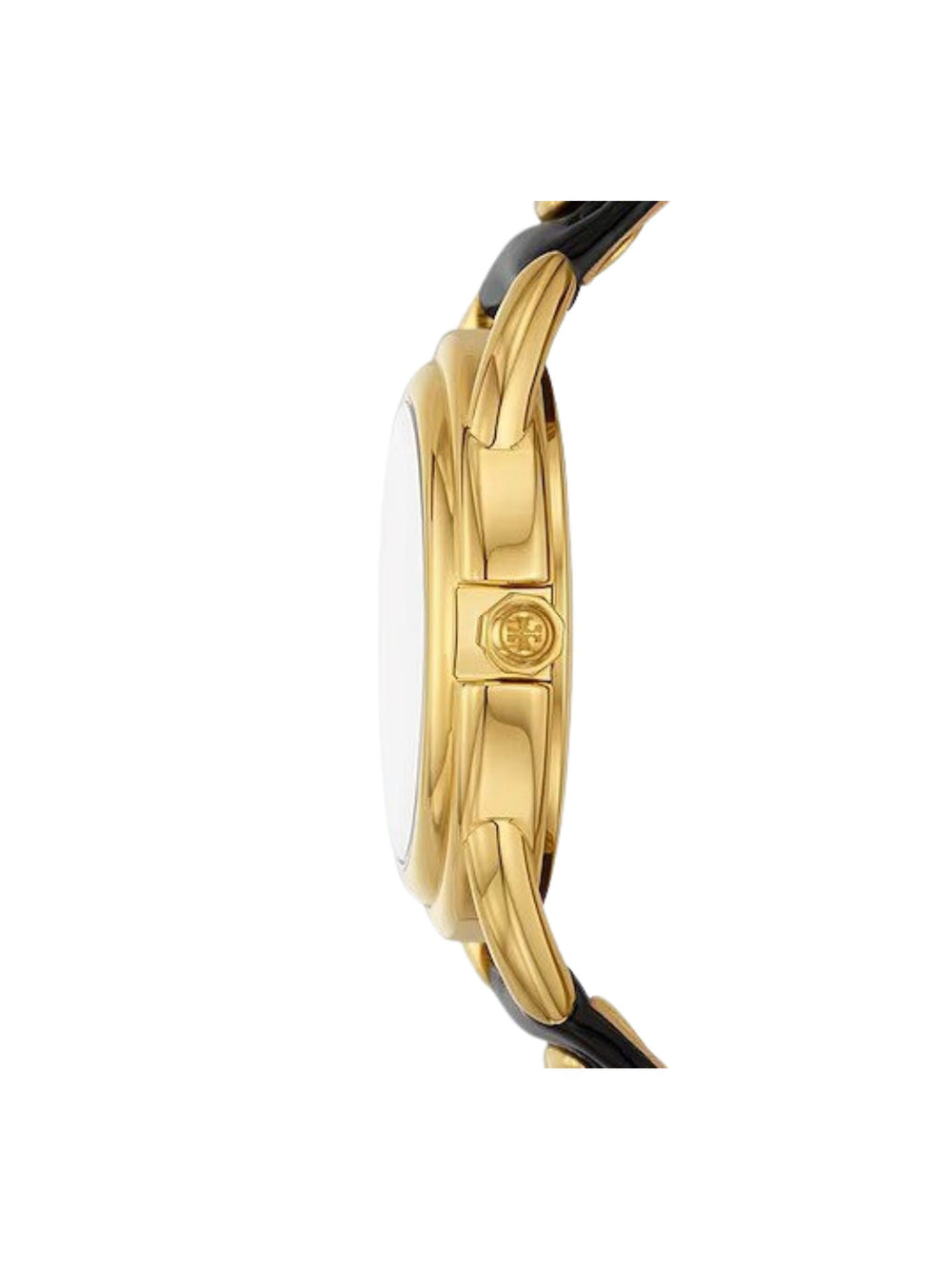 Make a fashion statement with this stylish Tory Burch Authentic Ladies Miller Gold Double T Watch. Crafted from luxurious stainless steel and leather, it features a glossy black dial with gold case and buckle closure strap. Water-resistant to a depth of 3 ATM/30 Meters. The ultimate accessory for the modern woman.