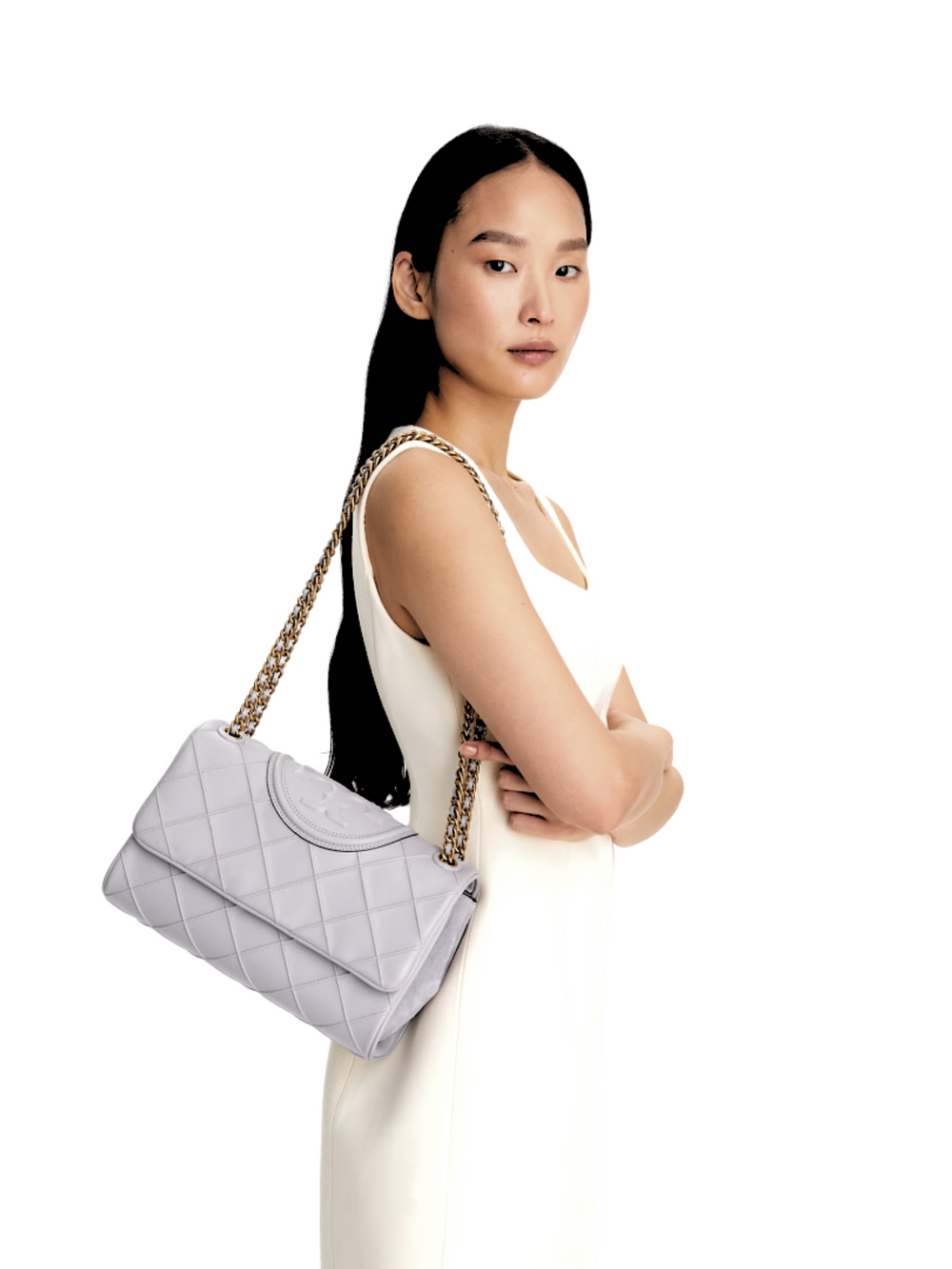 Crafted with precision, the Tory Burch Fleming Soft Convertible Shoulder Bag in Gray exemplifies luxury accessories at their finest. The supple leather construction features the iconic diamond quilting pattern and signature double-T logo hardware.