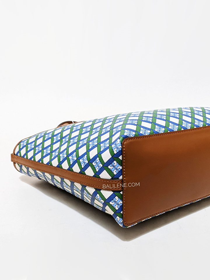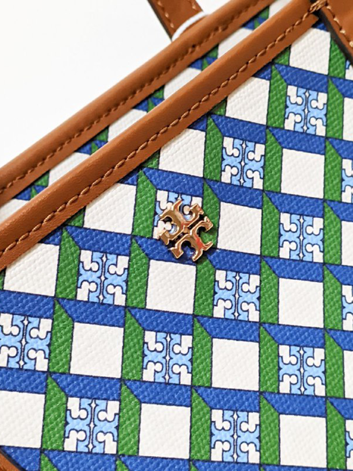 The printed coated canvas bag with smooth leather trim has a zip closure that opens to a fabric-lined interior with two slip pockets, one zip pocket, and an exterior slip pocket at the back