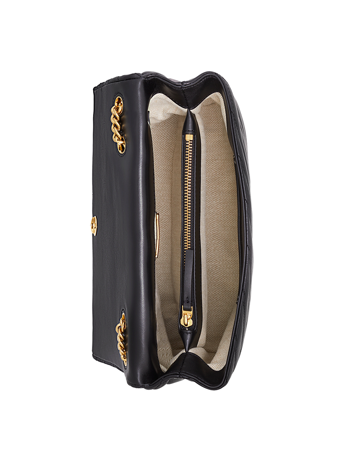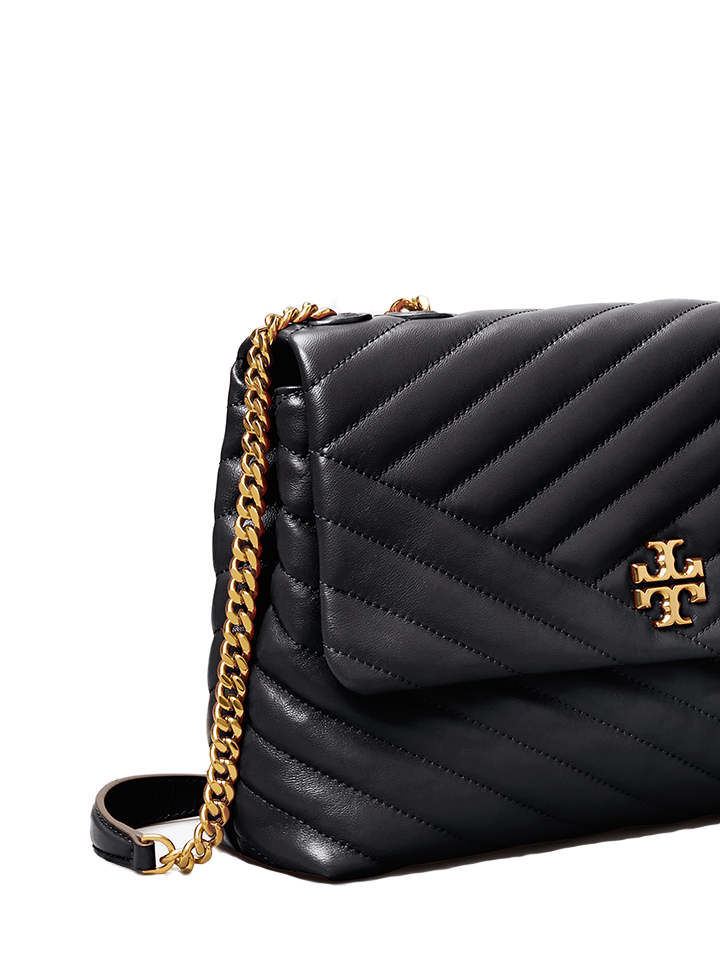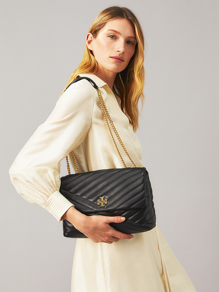 Our Double T as beveled hardware: the Kira Convertible Shoulder Bag, in soft chevron-quilted leather, has an adjustable linked chain strap that can be worn doubled or long and crossbody.