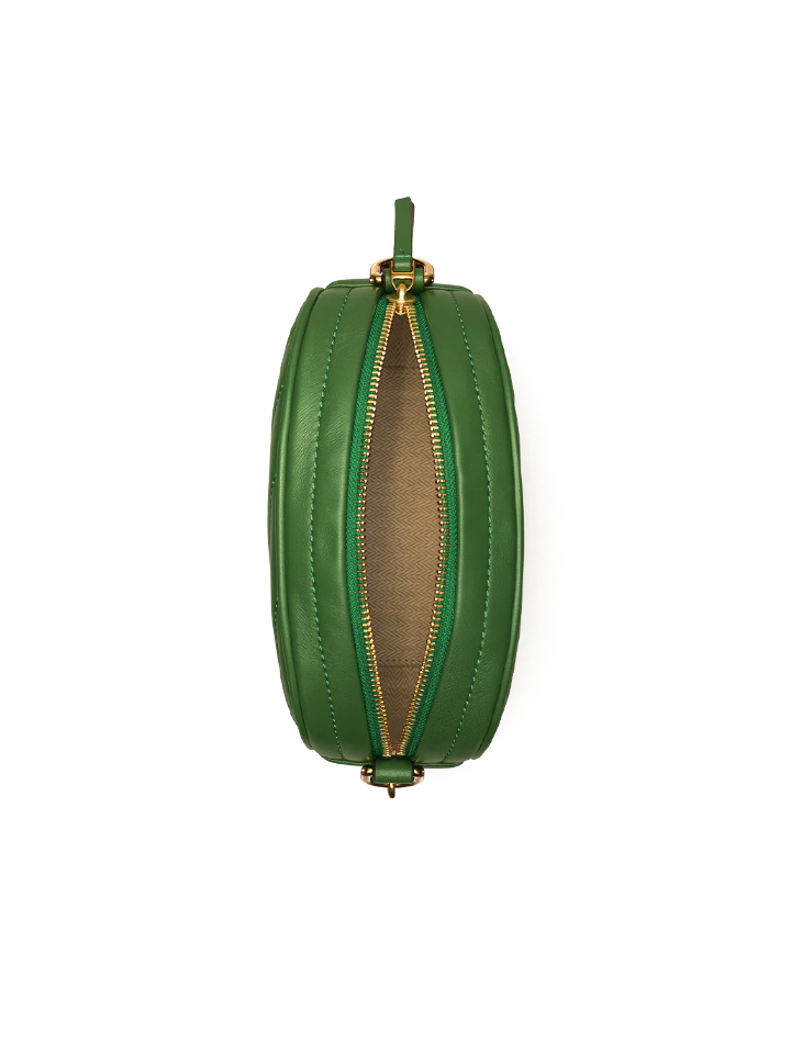 The Tory Burch Kira Chevron Small Camera Bag in Arugula combines sophisticated design with practical functionality. Its adjustable strap allows for versatile wear, making it an expert choice for stylish everyday use.