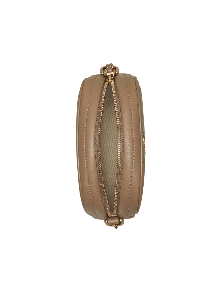 Tory Burch Kira Chevron Small Camera Bag Sandpiper is a small bag that is suitable for casual or daily use. Equipped with an adjustable shoulder strap, this bag features a neatly carved Tory Burch logo on the front and a zip pocket inside for storing small items.