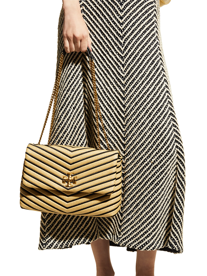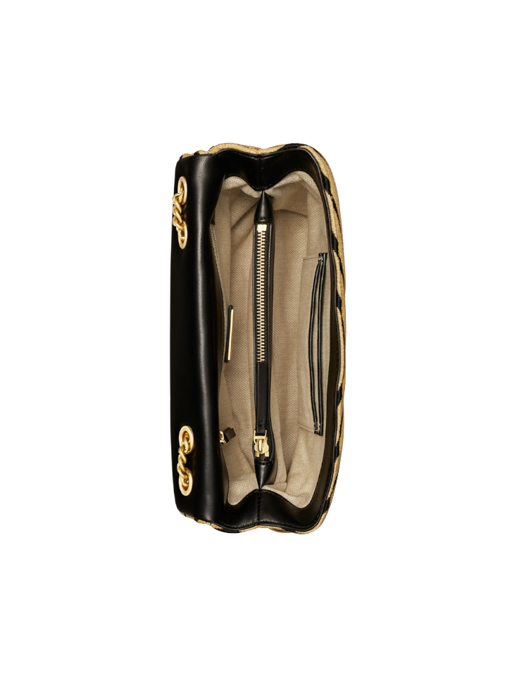 This chic Tory Burch shoulder bag is crafted with a combination of lambskin leather and straw-like fabric for a unique look. It features the iconic logo medallion at the front for an iconic touch and a sliding chain/leather shoulder strap for versatile styling. The flap top has a snap closure and the interior is divided by a center zip with two card slots and one zip pocket.