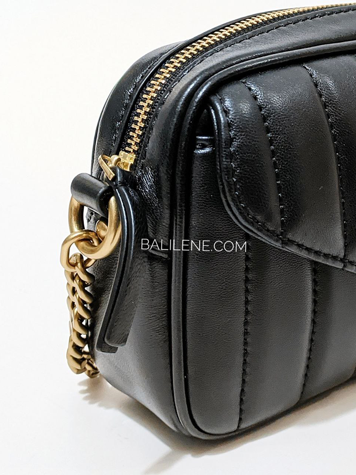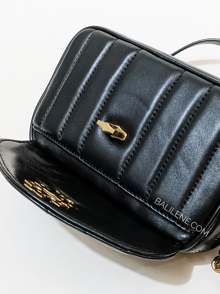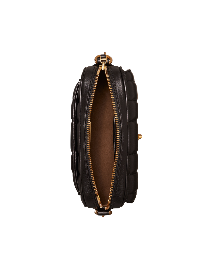 The Tory Burch Kira Mini Camera Bag in Back/Rolled Gold combines timeless design with functionality. Crafted with textured leather, it features a compact silhouette ideal for everyday essentials.