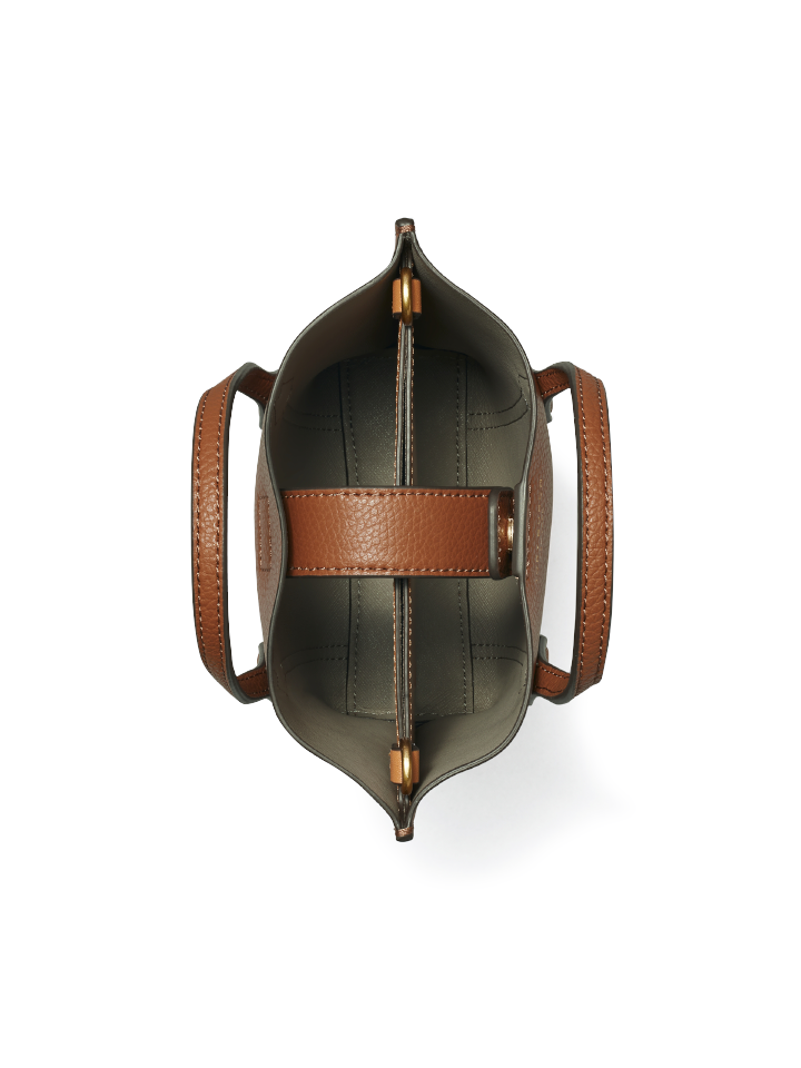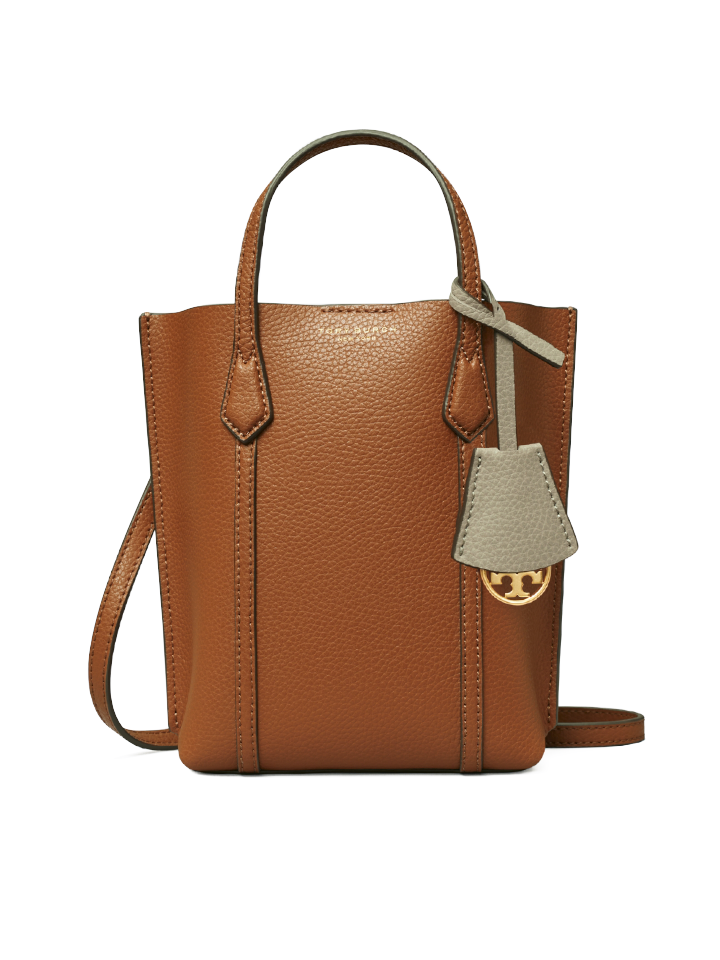 The Tory Burch Mini Perry Tote in Light Umber offers a refined, compact design crafted from high-quality leather, perfect for those seeking elegance and practicality.