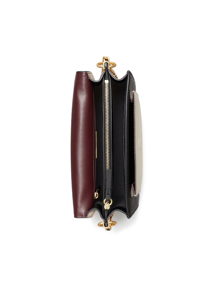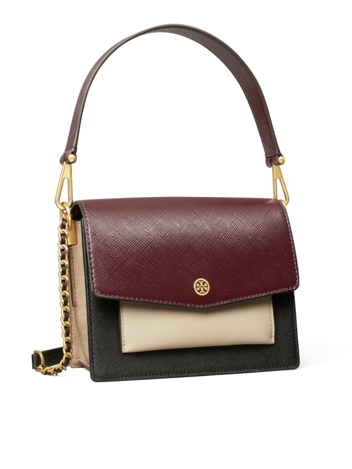 The Tory Burch Robinson Color-block Convertible Shoulder Bag in Black/Port offers versatile elegance paired with functional design. Ideal for both day and evening, this bag combines sophisticated style with practical usability, making it a timeless accessory in any wardrobe.