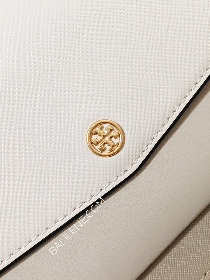 The Tory Burch Robinson Color-block Convertible Shoulder Bag in Brie/Seaside Sand offers versatile elegance with its sophisticated color-block design. Crafted from premium leather, this bag features a convertible strap that allows you to wear it as a shoulder or crossbody bag, adapting effortlessly to your style needs.